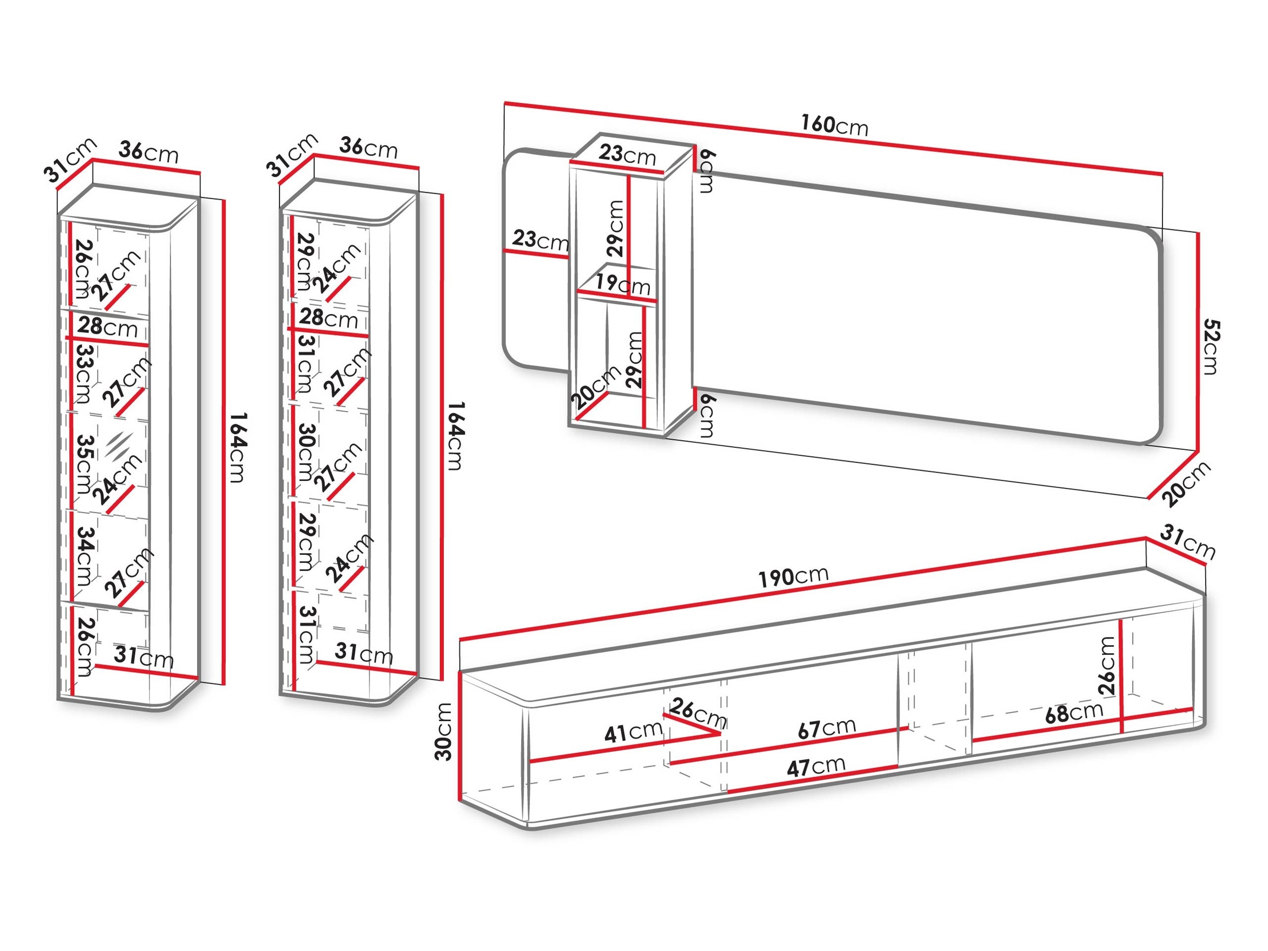 164 x 36 x 31; 52 x 160 x 20 cm