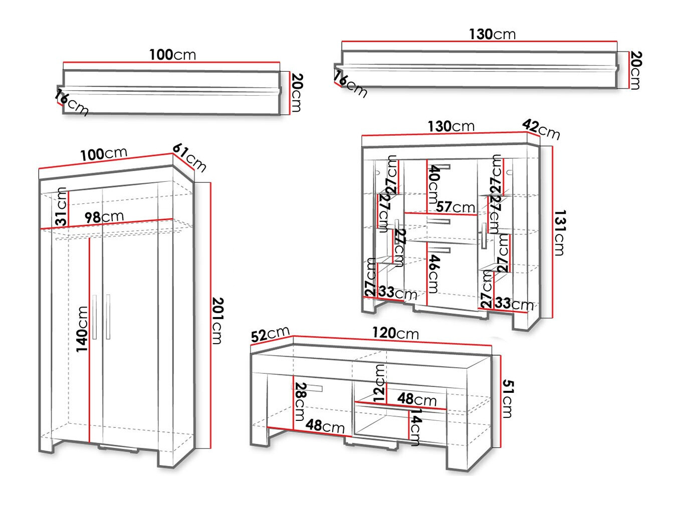 20 x 100 x 16; 20 x 130 x 16 cm
