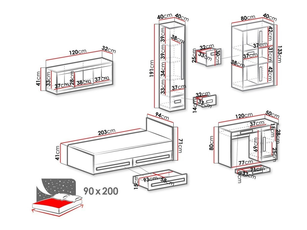 - 90 x 200 cm