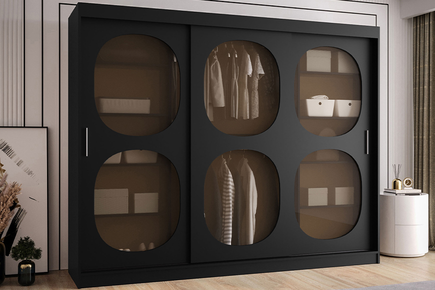 Dacă dulapul are uși din sticlă fumurie sau deschisă, ordinea cromatică devine și parte din decorul camerei. Culorile hainelor completează paleta spațiului, fără să îl încarce.