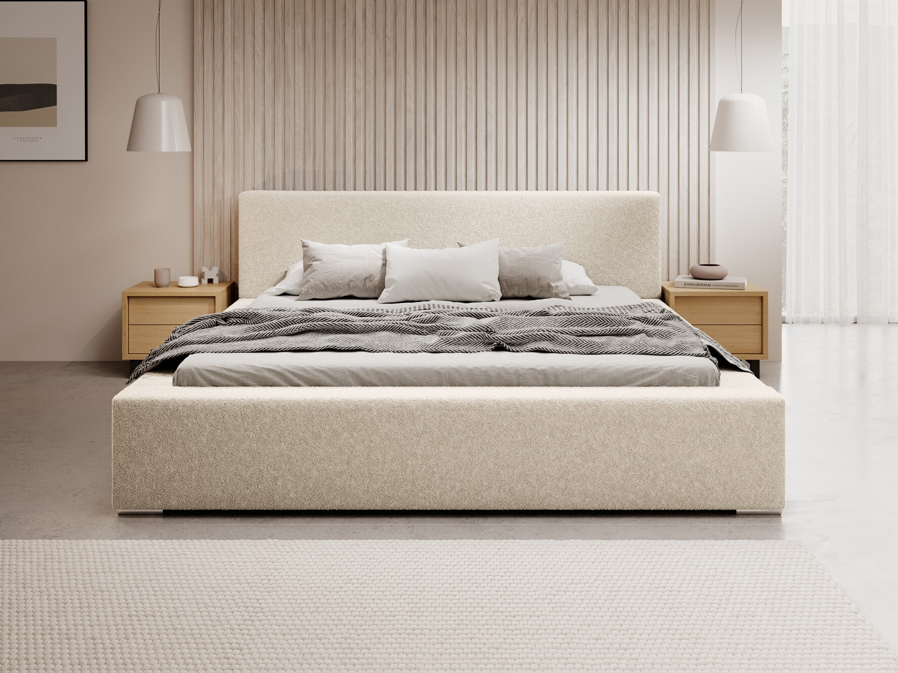 Un material realizat din poliester reciclat, cu un model format din bucle și noduri de dimensiuni variate, însoțit de un luciu subtil care oferă mobilierului un caracter distinctiv. Se recomandă curățarea suprafeței doar cu produse delicate, special concepute pentru tapițerie.