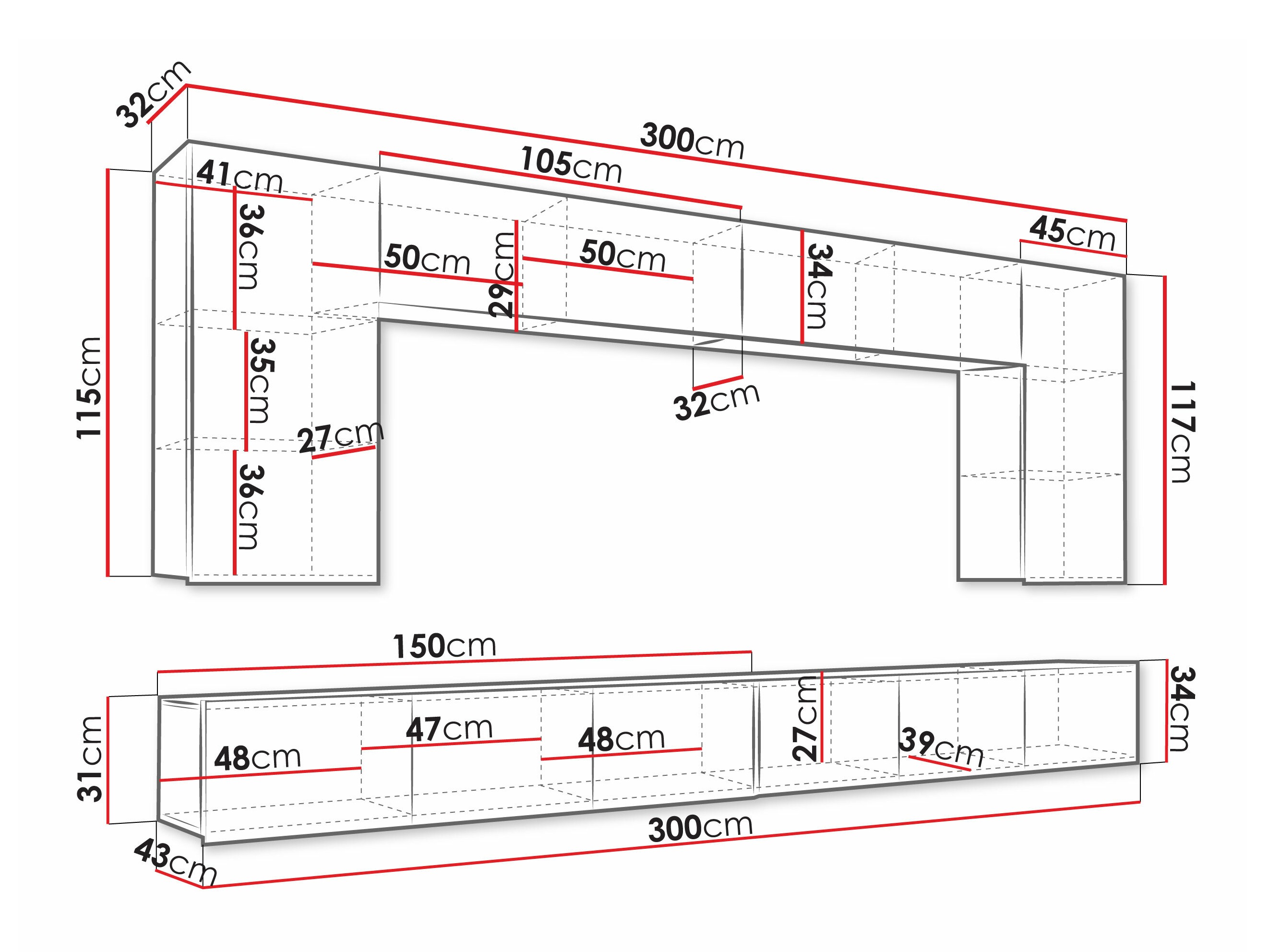 34 x 300 x 43 cm