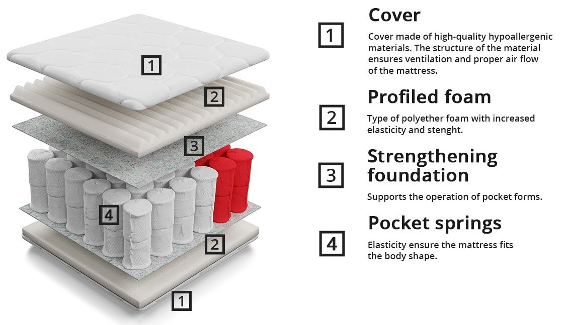 Am ales această saltea din timp. Au trecut 5 ani, salteaua nu s-a deformat, combinatia perfecta tare/moale. Saltelele cu arcuri buzunare durează mai mult. De aceea am ales această saltea specială pentru noul pat.